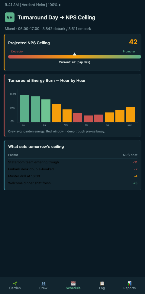 This is where the cross-pressure with the rest of the week becomes visible. When turnaround goes badly, the ripple runs through embarkation, first-night dinner, and port-day one. Verdant Helm surfaces that ripple as a forward cone: the NPS trajectory you will see on day three is already implied by the bed-state at 0930 on turnaround day. That cone is what lets the Hotel Director trade short-term turnaround efficiency for week-long NPS ceiling — a trade that is invisible without the botanical view.