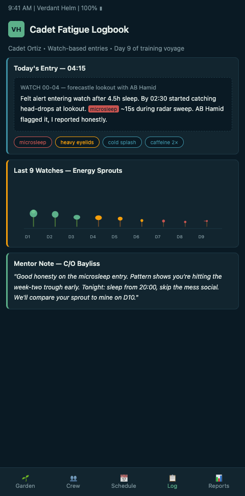 Verdant Helm treats the cadet's second notebook as the missing telemetry the TRB was never designed to collect. Each private entry becomes a garden reading on the cadet's own perennial — a seedling in the broader bridge bed. Seedlings need tending differently than established perennials. Their root systems are shallow, their cognitive reserves smaller, their wilt points closer to the surface. The garden renders this. A cadet perennial shows its bloom state, its trailing sleep window, its per-watch alertness signal, and its phase alignment with the Master and OOWs it is understudying.