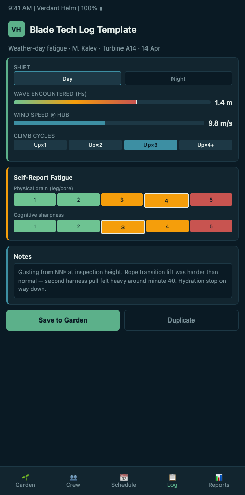 Verdant Helm treats the blade tech's logbook as the daily soil report from the tech's own perennial bed. A gardener who hand-writes a card after tending each bed captures pruning done, wilt observed, water added, pest pressure seen. The blade-day log serves the same function, and the template mirrors it.