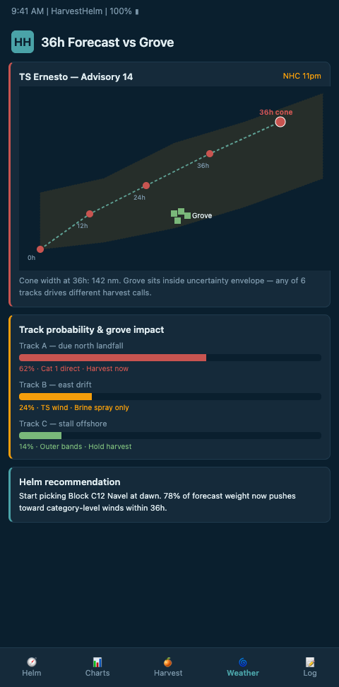 Scaling the helm-chart approach to multi-grove operations requires one more discipline: per-grove calibration of the three-track projection. A grove 30 miles inland of one further coastal grove will see the same storm evolution differently, and the pull-forward decisions will diverge. HarvestHelm treats each grove as its own helm chart — the captain can compare side by side but doesn't get a single grove-averaged recommendation that hides the heterogeneity. Growers with operations in multiple coastal counties report this as the single feature that most changes their season — the end of treating the NHC cone as one gauge for all parcels.
