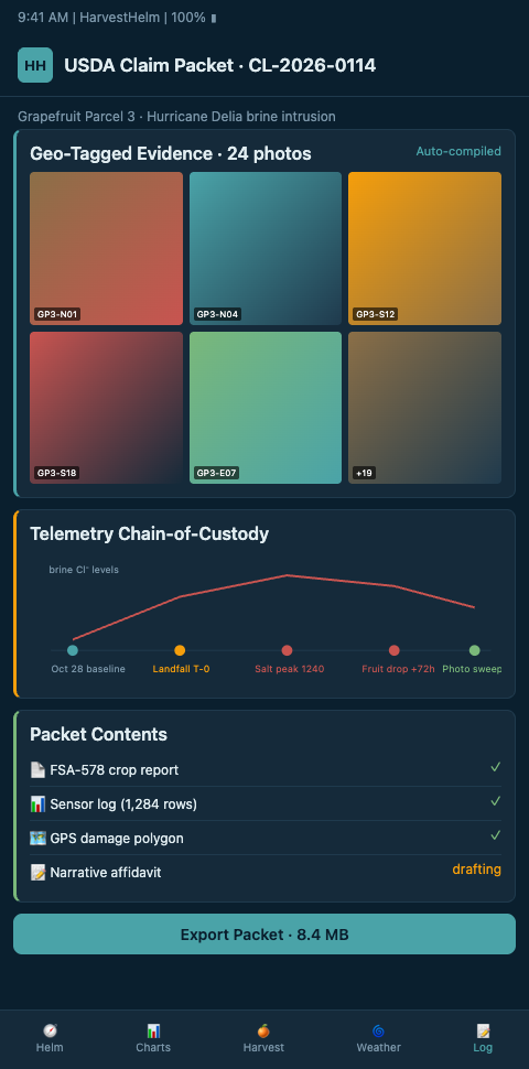 Coastal Valencia, Hamlin, Murcott, and Navel growers filing NAP, TAP, SDRP, or state-grant claims after brine-damage events cannot afford documentation gaps that delay payouts by months. HarvestHelm maintains the five-layer evidence chain — pre-event baseline, event telemetry, post-event damage log, lab and expert materials, financial exposure — continuously across the season, then exports the bundle in FSA and RMA-accepted formats. Zero platform fee. The kilo-cut on successful harvest keeps the tool's incentive aligned with getting your disaster claim paid, not generating reports nobody reads.