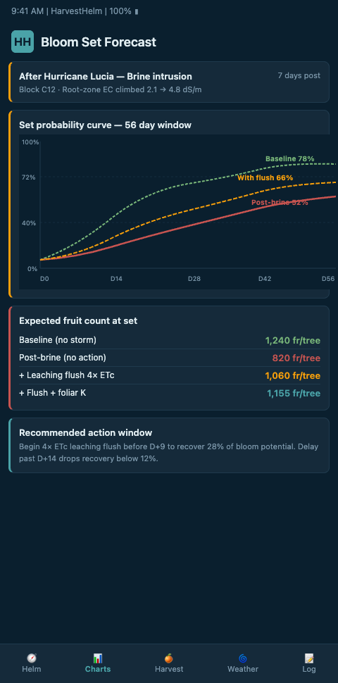 UF/IFAS EDIS HS1399 summarizes the extension guidance for water-stress timing and inputs to improve flowering after stress events (UF/IFAS EDIS HS1399: Management Options for Improving Flowering in Citrus), and Citrus Industry's reporting on mandarin blooming and fruit set shows that only 1-5% of flowers become harvestable fruit — so the forecast models both the bloom count and the set ratio (Citrus Industry: Understanding Mandarin Blooming and Fruit Set Requirements). A moderate brine event can push bloom count up while pushing set ratio down; the helm chart shows the two curves together so the captain can read net yield.