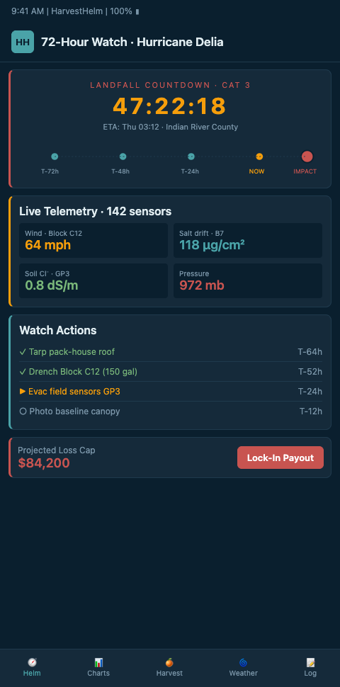 At T+24 the dashboard rebuilds: damage-inspection team routing, sensor-survival audit queue, post-storm irrigation triage, packhouse routing confirmation for pull-forward blocks still in transit. The Aon 2024 Hurricane Response Checklist provides an enterprise-grade 72-hour SOP reference that HarvestHelm maps onto grove-specific assets.
