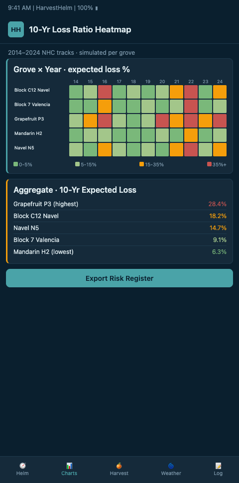 The 10-year hurricane-track window matters specifically because it is the actuarial period that most crop-insurance underwriters and juice-plant contract negotiators default to when pricing forward risk. A longer window smooths out the decadal variability that matters to an individual grower; a shorter window fails to capture enough storms to produce stable statistics. Ten years is the actuarial sweet spot, and HarvestHelm's helm uses exactly that window as the default for grove-level loss-ratio export — with sliders that let the grower rerun the export on 7-year and 15-year alternatives when the negotiation requires a different framing.