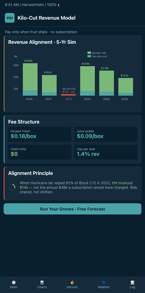 Cash flow timing matters almost as much. Subscription contracts typically bill monthly or quarterly on a calendar that bears no relation to Valencia or Hamlin harvest timing. Kilo-cut billing runs on the packinghouse clearance — HarvestHelm invoices when the cartons clear, so the grower is paying out of the same cash flow the helm just helped generate. That alignment eliminates the quarterly-subscription-payment-during-pre-harvest-cash-crunch dynamic that drove many of the 2022-2023 sensor cancellations. The broker hedging his Valencia forward contracts can plan the HarvestHelm fee against the packinghouse receivables schedule with confidence, which the subscription model never allowed.