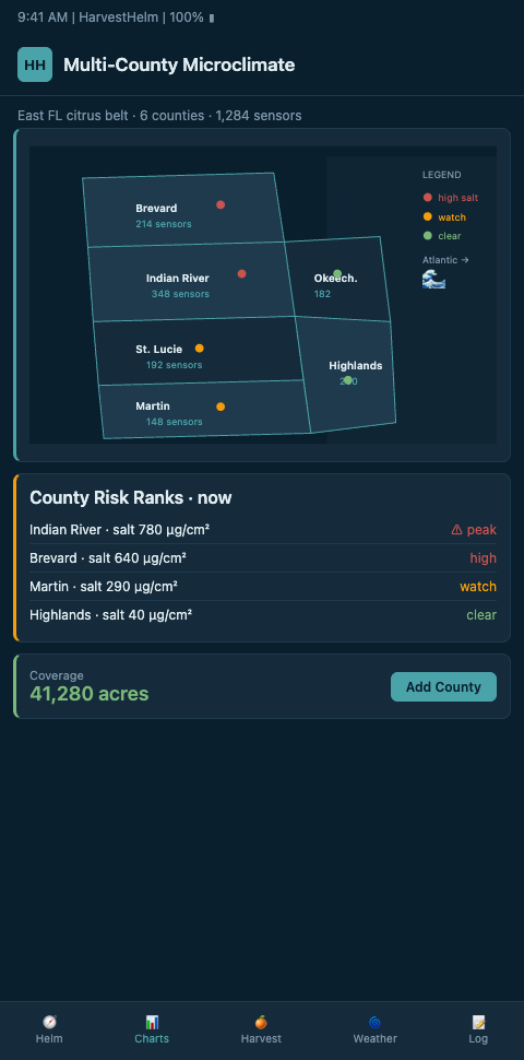 HarvestHelm treats the multi-county citrus operation the way a yacht captain treats a 200-mile offshore passage: as one continuous chart with waypoints, not three separate legs handled by three different crews. The platform consolidates every in-grove sensor, every gateway, every NWS advisory, and every satellite plume overlay into a single helm-charted yield forecast that shows the captain — the operations manager — where salt-spray blackout will hit which Valencia block, with how many hours of lead time, and at what expected brix drop.