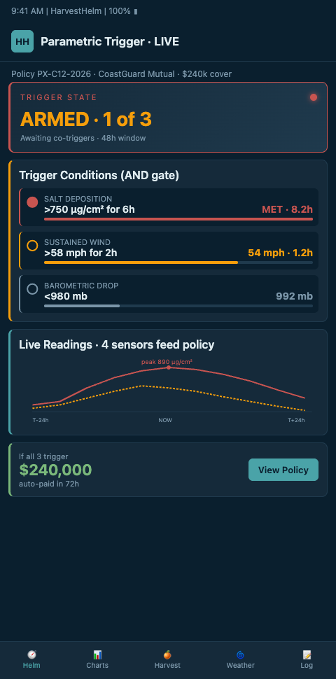 HarvestHelm is structurally well-suited to feed parametric insurance triggers because every sensor the helm runs is already calibrated, timestamped, and auditable — the same salt-aerosol probes that fire the hurricane-hour early warning beacon double as the parametric-payout trigger source. Because the sensor network rides on a kilo-cut sensor revenue contract, the grower pays nothing upfront for the trigger infrastructure — the same probes serve both the helm's harvest-save logic and the parametric payout. The helm-charted yield forecast exports a continuous telemetry stream that a parametric policy can reference via API, with cryptographic provenance the insurer can trust. The yacht-style helm becomes the trigger engine, not just the operations dashboard.