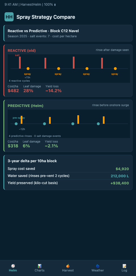 Reactive fresh-water rinse crews cost coastal citrus growers more per acre than predictive mitigation and still miss the 18-hour salt-damage window routinely. HarvestHelm sequences kaolin, night-irrigation, and copper by rootstock and block exposure against the live helm-charted salt-aerosol forecast, keeping Valencia, Hamlin, and Murcott leaves inside the 1,500 ppm foliar safe zone through active tracks. Nothing upfront. The kilo-cut on successful harvest aligns the tool with the canopy you keep alive, not the rinse trucks you dispatch post-storm.