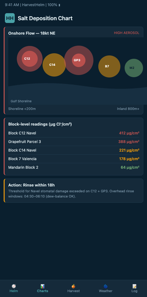 The core signal HarvestHelm pulls is wind speed crossing the 3.0 m/s critical threshold. Brazilian coastal measurements found marine salt deposition is strongly influenced by onshore winds above that speed (ScienceDirect: Measurements and modelling of marine salt transportation Brazil). Below 3.0 m/s, aerosol drops out fast. Above it, chloride rides inland — and the falloff curve shifts. A grove dashboard that doesn't resolve wind speed at the block level can't distinguish a 2.8 m/s day from a 4.1 m/s day, and those two days produce completely different salt loads on the same row.