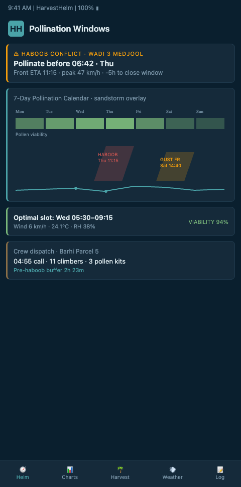 HarvestHelm treats pollen application the way a yacht captain treats a narrow channel at low tide. The helm-charted yield forecast displays a countdown timer tied to spathe-crack detection for each tagged palm, overlaid with a 72-hour dust-risk band drawn from WRF-Chem 2 km simulations and on-site particulate sensors. The captain — meaning the grove operator — watches the heading indicator turn from green to amber as the sandstorm probability climbs past 35% for any hour inside the receptivity window. When the amber band crosses into the next 12-hour slot, HarvestHelm recommends pulling crew forward by six to eight hours rather than waiting for the traditional mid-morning dusting slot.