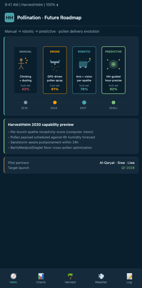 HarvestHelm's helm-charted yield forecast is the coordinating layer that makes autonomous pollination operationally coherent. The yacht dashboard does not fly the drone or drive the liquid-suspension rig — but it tells the autonomous system which palms to visit, in what sequence, at what pollen concentration, and against what arrival deadline. A drone pollinator without a sensor-fed dispatch layer is a tool looking for a job; paired with a helm-charted yield forecast, it becomes a surgical instrument matched to the 72-hour Medjool window or the 7-day Deglet Noor window.