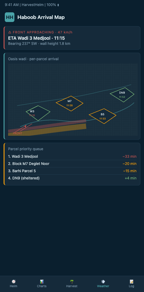 HarvestHelm treats each wadi as a separate navigation leg on the helm-charted yield forecast. The captain sees a ladder of arrival windows — each palm block tagged with an expected dust-front hit time drawn from the combination of regional radar, on-site anemometers at the windward edge, and a pre-calibrated deflection model tuned to your oasis geometry. The Pollination Window Countdown Timer displayed at the top of the dashboard shows the nearest at-risk spathe with its remaining receptivity hours; the map panel shows the incoming dust front with its predicted arrival per wadi, color-coded amber as it enters the 30-minute warning band.