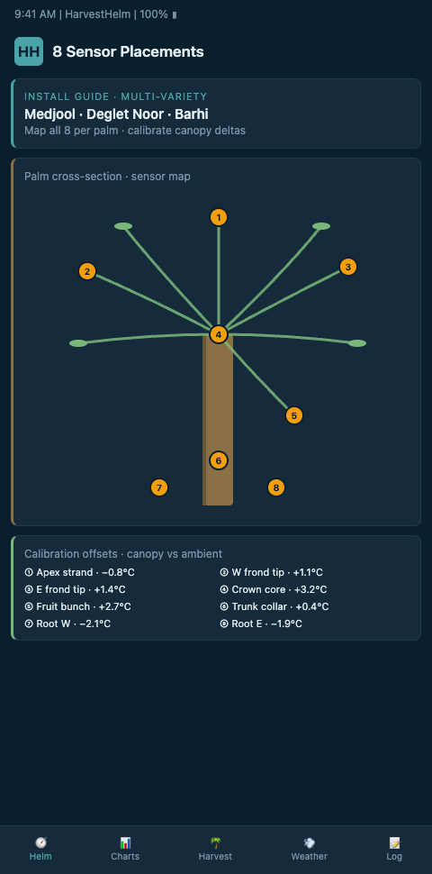 HarvestHelm's sensor architecture treats the grove like a yacht's nav suite. You don't rely on a single GPS — you have GPS, compass, depth sounder, wind instruments, and radar, each feeding a specific layer of the helm chart. The same multi-instrument logic applies to date groves. The helm-charted yield forecast asks for eight specific placements per block, each mapped to a distinct forecast layer. Placement 1: canopy-level air temperature and humidity at 4 meters, directly under the date cluster zone, one per cultivar block. Placement 2: sub-canopy at 1.5 meters to capture the shaded diurnal swing. Placement 3: soil temperature and moisture at 30 and 50 cm to track root-zone stress. Placement 4: windward-edge anemometer at 6 meters to catch haboob and khamsin arrival signals. Placement 5: leeward-edge particulate sensor to measure dust deposition after each event.