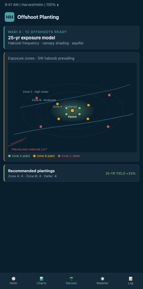 HarvestHelm treats offshoot planting as a long-range passage plan. The helm-charted yield forecast runs a 25-year sandstorm exposure projection per candidate planting location using regional haboob climatology, the grower's on-site wind history, and windbreak-growth models for any proposed shelter plantings. The output per candidate site is a cumulative exposure score across the expected productive life, plus a projected lifetime yield delta compared to baseline. Growers comparing three or four candidate zones typically see 20-40% lifetime yield spreads, which is enough to justify moving offshoot placement by 30-60 meters when the alternative zone is available.