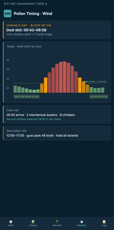 HarvestHelm treats pollen application timing as a navigation problem: the captain is steering the pollination event through a gust field, and the helm-charted yield forecast tells the captain when to push the throttle. The dashboard reads 1-minute wind vectors from multi-height anemometers placed at ladder-crown level (10-12 m) rather than at the standard 2 m weather-station height, because the crown is where pollen actually meets stigma. Crown-level telemetry routinely shows 30-50% higher gust amplitude than ground readings, which is the entire reason reported wind conditions so often disagree with field experience — the same instrumentation gap that drives pollination sandstorm timing workflows where wind-forecast integration sets the primary scheduling loop.
