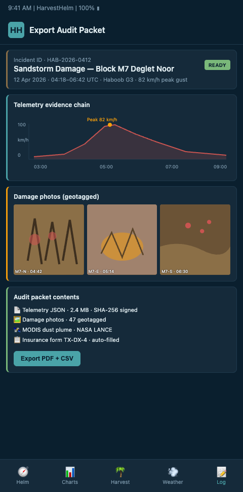 The first advanced tactic is insurance and financial-instrument linkage. The same audit-grade documentation that supports export audits also supports crop insurance claims and any parametric sandstorm-damage instruments the operation carries. HarvestHelm exports the documentation package in formats compatible with major insurance adjuster workflows, and operations carrying parametric coverage can trigger payouts directly from the sensor thresholds without a separate claims process. This linkage reshapes both premium negotiations and claims acceleration, transforming storm documentation from a cost center into a financial-instrument asset.