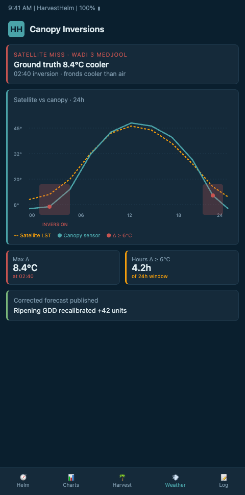 The NDSU extension article on air temperature inversions causes and characteristics documented that inversions over crop canopies form sooner and more intensely than over bare soil. Palm canopies amplify this further because the dense frond structure traps cold air overnight at the palm base — exactly where fruit clusters hang during late Kimri and early Khalal stages. HarvestHelm's Diurnal Swing Compensation for Fruit Set reads the inversion-layer signature from sensor placement 1 (canopy-level) versus placement 6 (oasis floor) and flags when the gradient exceeds cultivar-specific tolerance. Operators who have deployed hyperlocal sensor placement correctly see these inversions as resolved data rather than theoretical hazards.