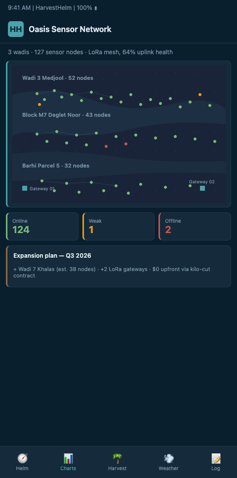 If you run Medjool, Deglet Noor, Barhi, or Zahidi blocks scattered across multiple wadis, you already know that a regional forecast cannot describe what's actually happening at parcel 7 on a hot afternoon. HarvestHelm deploys a LoRa mesh engineered for trunk-dense oasis geometry, anchors it with gateways sited for corridor-wide line-of-sight, and charts the whole operation on a single yacht-style helm so you can steer ladder crews, pollination runs, and evacuation calls with confidence. Because the kilo-cut pricing model charges nothing upfront and only a share of the successful harvest, densifying your sensor coverage costs you nothing in advance — it pays back when fruit set and Medjool export grades beat your five-year average.