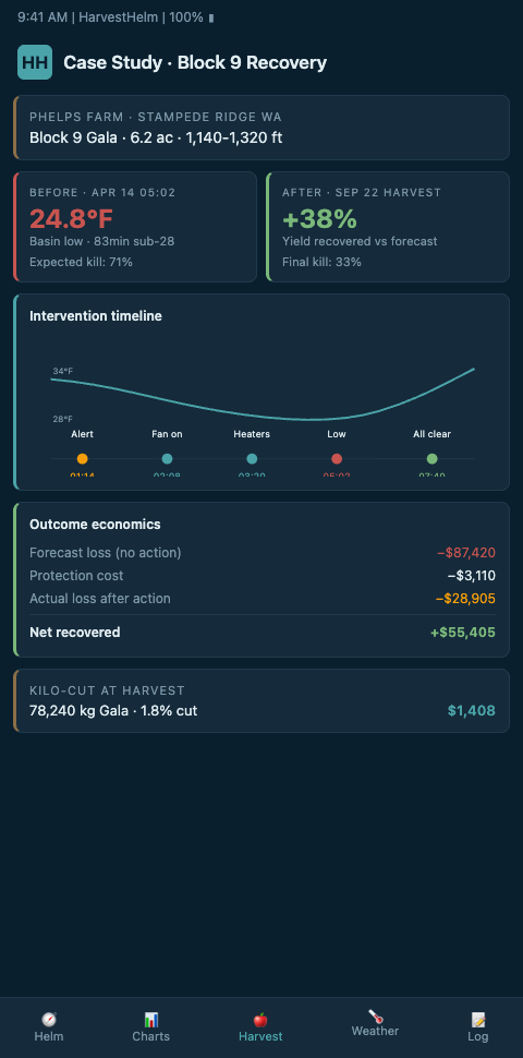 Honeycrisp blocks in New York, Michigan, Vermont, and Western NC lost hundreds of millions in 2023 to freezes that were navigable with the right data. HarvestHelm gives mountain orchardists the block-by-block visibility to separate king-bloom mortality from side-bloom salvage, and our kilo-cut model means you pay nothing until the packhouse scale clears a recovered harvest. Waitlist growers get priority sensor allocation for the 2026 bloom window, ahead of the next cold-air drainage event. Lock in your spot before the next freeze writes the first chapter of your 2026 recovery playbook. Pilots signing before April get the 85-to-100 GDD post-petal-fall triage timing pre-configured so the surgical thinning pass fires in the 4-day window that separates 38-percent recovery from 22-percent recovery on the same viable-bloom base.