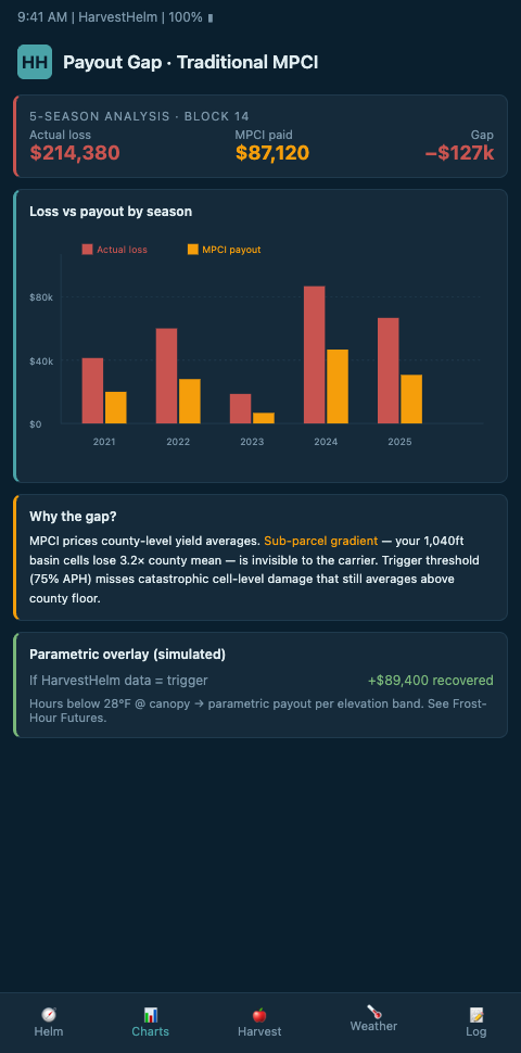 HarvestHelm quantifies the pricing gap block by block. By running parallel analysis of actual sensor-measured frost exposure against APH-implied frost exposure, the helm produces an "under-insurance ratio" per block. A Block 22 Honeycrisp in a cold sink might carry an actual 27% chance of a critical frost hour annually while the APH-implied rate is calibrated to the county-average 11%. That gap is pure underpricing — the grower is effectively self-insuring 16 percentage points of tail risk through the structure of the policy they already pay for.
