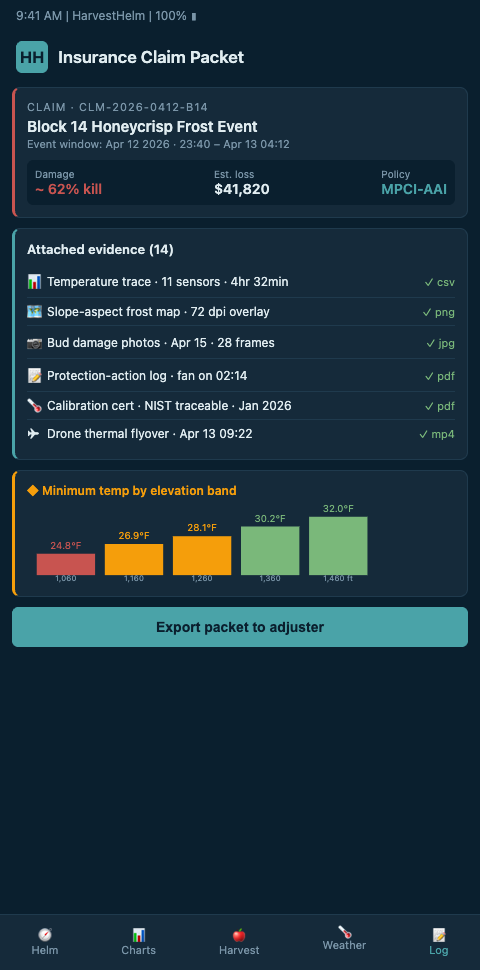 The failure mode is under-documentation. Growers often notice a frost event, note it mentally, and expect to provide details when the adjuster arrives. The three-week gap and ongoing orchard operations erase detail. HarvestHelm's automatic claim-bundle trigger eliminates that risk by opening the documentation the moment the threshold is crossed — no manual trigger required.