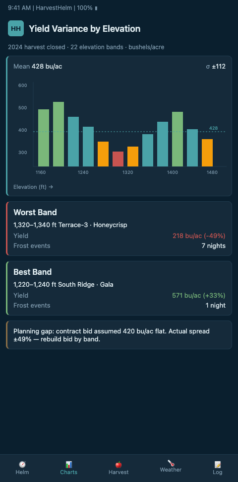 Mountain apple growers running elevation-band Honeycrisp and Gala blocks are getting squeezed hardest by the mismatch between one-number forecasts and four-crop reality. HarvestHelm is onboarding block-level growers, apple brokers, and packhouse operators ahead of the next harvest crunch window. We install sensors across your elevation profile, deliver block-by-block bin forecasts your broker can actually contract against, and take a kilo-cut only on cleared tonnage — so there is no upfront risk to replacing the clipboard average with an honest chart of what your slope will actually produce. Pilot slots include a walk of your four largest elevation bands with the forecast engineer, mapping each band's Gala, Honeycrisp, and Enterprise acreage to its own bin projection and contract window.