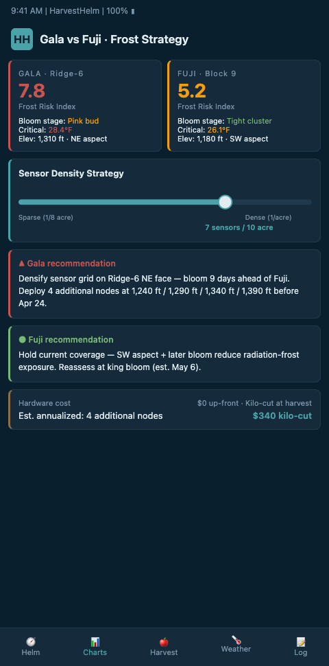 The yacht metaphor lines up cleanly. On a yacht, instrument density follows risk — you carry more depth soundings through a narrow channel than across an open bay. The same principle applies to mixed-cultivar orchards. Gala is the narrow channel, Fuji is the open bay. HarvestHelm's probe deployment tool calculates recommended density from the cultivar map and the historical frost-event log, and the grower can see the marginal protection value of each additional probe before deployment.