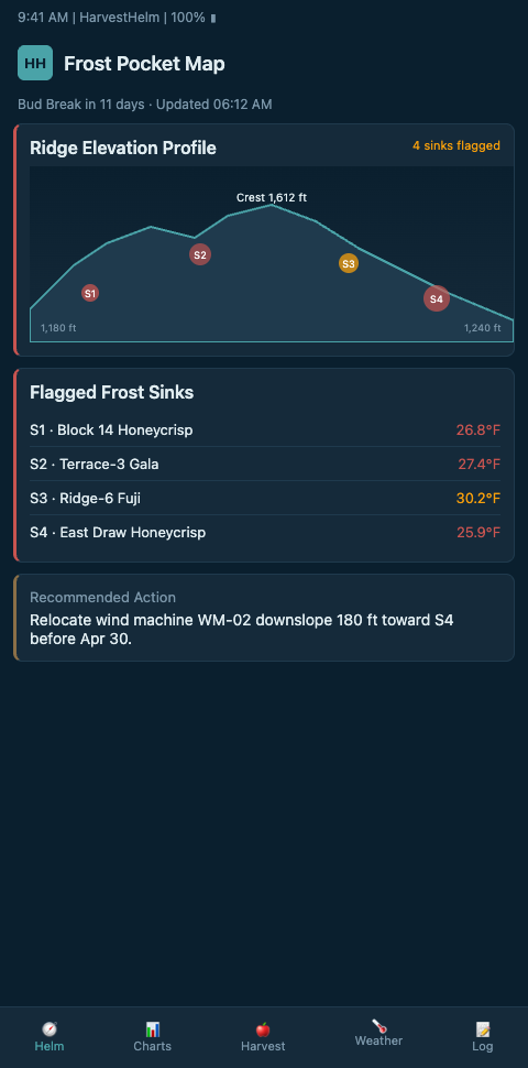 Mountain orchardists running elevation-band plantings — especially Honeycrisp on Block 22 and Gala on Block 14 — do not have to keep betting the whole orchard on an oldest-grower memory of frost pockets. HarvestHelm is building a waitlist for the next pre-bud-break season with mountain apple growers running fragmented slope parcels. Join and we will help you cold-air survey your worst block before March bud-swell, install paired probes only where they actually change a decision, and charge nothing until the kilos hit the packhouse scale in the fall. Waitlist slots include a pre-bud-break walk of your two worst-remembered frost pockets with a HarvestHelm field technician, delivered as a shareable chart your foreman, packhouse, and fruit broker all see from the same helm display.