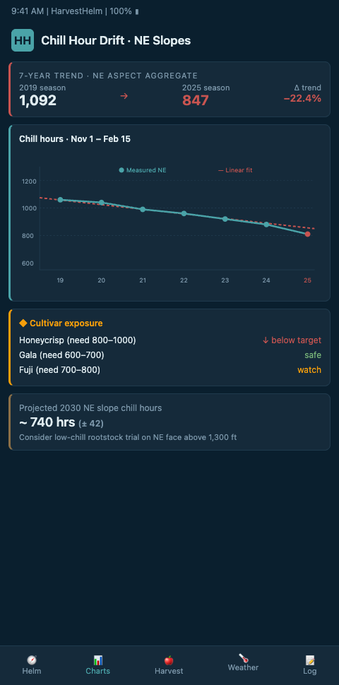 HarvestHelm's approach separates macro-drift (regional warming trend) from micro-drift (block-specific elevation-band accumulation variance). A northeast slope at 2,240 feet in the Green Mountains may gain 80 chill hours per season versus a parallel block at 1,650 feet — which is the buffer that determines whether Honeycrisp stays viable for another 15 years on that specific terrace. The helm shows this block-by-block, so when the time comes to replant, the data already specifies which parcels are the first candidates for lower-chill cultivar rotation.