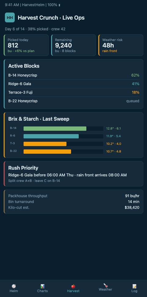 Mountain orchardists running Honeycrisp and Gala pick windows on steep ground need a helm display built for 60-second decisions, not a 47-tile executive summary. HarvestHelm ships a crunch-mode layout with offline tolerance, bin-routing and crew-rerouting as one-tap actions, and block tiles colored by the same helm-charted yield forecast driving your fan triggers and pick schedule. No upfront cost — just a kilo-cut when the packhouse scale clears. Tell us your current pick window length and how many blocks are in rotation when you join the waitlist, and we will prototype your crunch-mode tile layout before the first Honeycrisp block breaks.