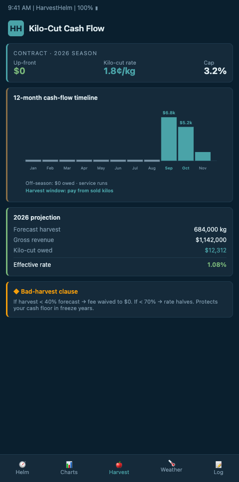 Think of pay-per-harvest contracts the way a yacht charter captain thinks about a revenue-share voyage: the captain does not pay the crew before the passage starts — they pay out of the charter fees earned at the end. A helm-charted yield forecast under a kilo-cut model works the same way. HarvestHelm deploys the full sensor network, mesh, and dashboard at zero upfront cost, and gets paid only when the packhouse scale clears the recovered or protected harvest. The kilo-cut is a per-kilo fee on fruit that made it to market — typically a few cents per kilo, capped well below the yield-protection value the sensors delivered.