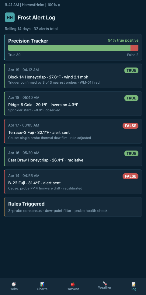 Pilots starting before December bootstrap from HarvestHelm's regional training pool so south-facing Honeycrisp and Enterprise blocks get ML-tuned thresholds before 2-3 seasons of in-house history accumulate. Day-one dashboard views show dew-point-gated and leaf-temperature-aware alerts tiered by response cost — wind-machine standby, sprinkler deployment, full crew callout — so a marginal night never escalates the $120-180-per-event diesel burn beyond what the actual frost signal justifies. The onboarding quarterly-calibration schedule sweeps every probe against a reference thermometer across a 90-minute morning, catching drift before it builds six weeks of false alarms. The kilo-cut contract settles only on cleared Honeycrisp, Gala, and Enterprise tonnage that the credible alert layer protected, so a chronic false-positive block costs us before it costs your crew trust.