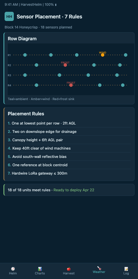 These seven rules combine to produce what we mean by a helm-charted yield forecast. The sensor grid is not a passive monitoring system — it is an active navigation chart. Each probe's role-tag maps to a decision type (advisory, action, critical). Each pair-probe delta maps to an inversion-strength reading. Each canopy probe maps to a bud-stage forecast. The grower sees one dashboard that reads like a yacht helm display: status at a glance, detail on demand, decision points highlighted. HarvestHelm assembles that display specifically for mountain terraced orchards.