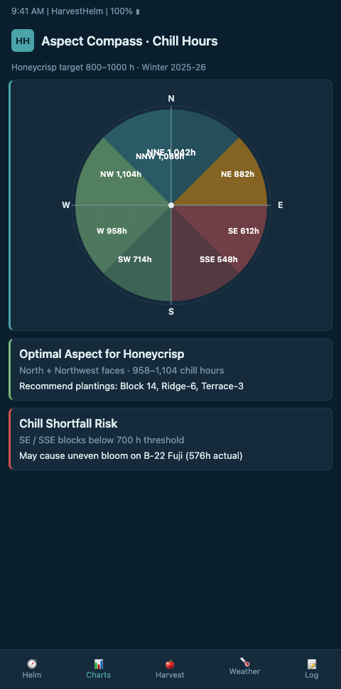 HarvestHelm reads probe data against the selected chill model and highlights aspect deltas before bloom — giving you three to five weeks of warning to shift thinning expectations, adjust harvest staffing, or change packhouse bin allocations. For growers weighing replant decisions, the cultivar frost selection guide covers how to choose varieties when a block's aspect is fundamentally incompatible with the variety planted there.