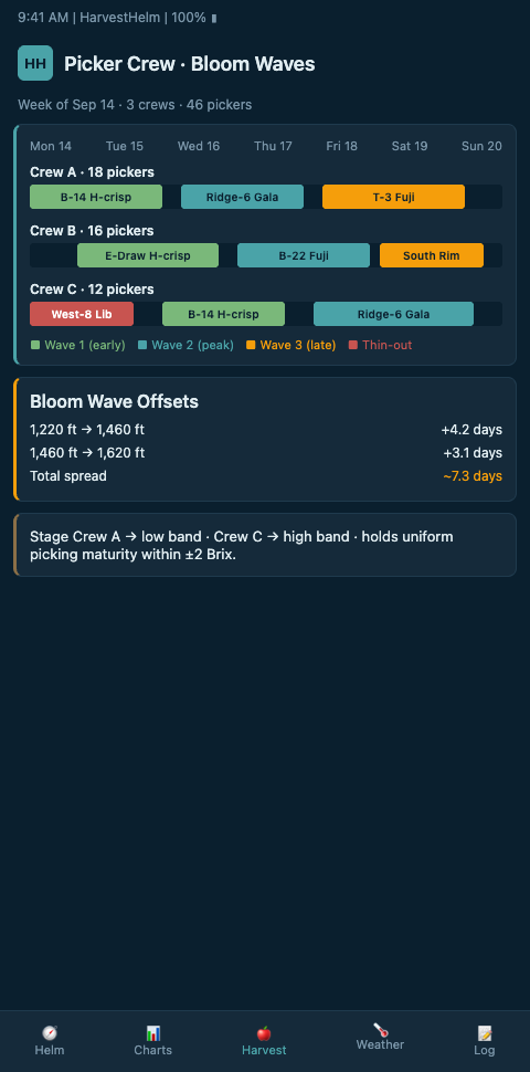 HarvestHelm treats crew staging as a routing problem on a yacht-style helm display. Each block is a waypoint on the chart, and the helm-charted yield forecast computes arrival order by bloom-wave offset, cultivar pass count, and crew speed per tree. The planner does not ask "which block is ready Monday" — it asks "given five crews, how do we traverse 14 blocks so each crew hits every block at its peak pick window across the next 21 days." A SpringerLink chapter on harvest planning optimization in Chilean apple orchards documented that a block-sequencing optimization model cut labor costs and income loss by 16% compared to calendar-based plans — and the Chilean orchards in that study had less topographic variation than a Pacific Northwest mountain operation.