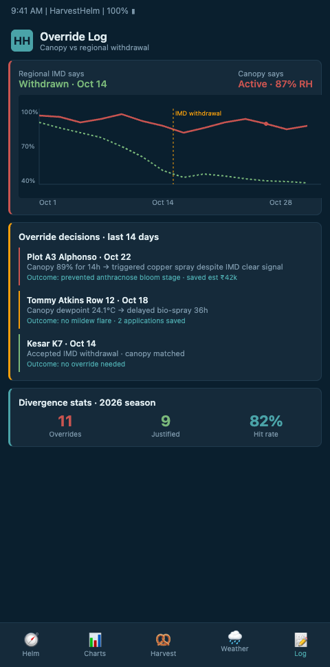 HarvestHelm treats the withdrawal-versus-canopy contradiction the way a yacht navigator treats a weather forecast that contradicts the barometer. The helm-charted yield forecast keeps the plantation's decision logic anchored to canopy-level readings rather than to regional declarations, while still surfacing the contradiction explicitly so the grower understands the divergence. When IMD declares withdrawal but plantation sensors continue reading 90-plus percent RH for sustained windows, the dashboard flags the discrepancy, holds disease-monitoring protocols active, and re-weights the next several trigger windows with higher caution. The captain does not stop watching the glass because the forecast says the weather has cleared.
