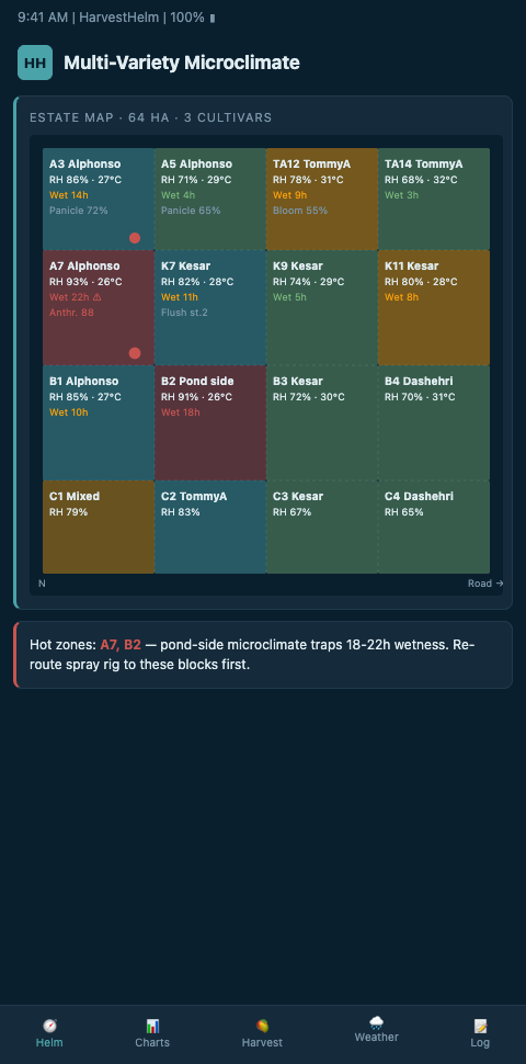 Canopy microclimate mapping is not a research exercise — it is the foundation that every downstream operational decision depends on. Spray timing, labour staging, harvest pull-forward, and export routing all require an accurate read of what each block is actually experiencing, cultivar by cultivar. A plantation running a single met station is navigating with a sketch map of the coast; a plantation running a dense canopy sensor grid is navigating with a full chart. HarvestHelm's kilo-cut monetization means the platform earns only when export-grade fruit clears — so the dashboard's mapping recommendations carry exactly the grower's financial incentive. Mixed-cultivar plantations in Krishnagiri, Kolar, and Ratnagiri that have built out proper canopy microclimate maps report 15 to 22 percent reductions in rejection rates across cultivars, with the biggest gains on the most susceptible varieties. The canopy is not uniform. Your map should show you exactly where it isn't.