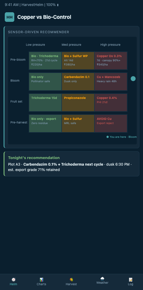 HarvestHelm treats the copper-versus-bio-control decision the way a yacht captain chooses between sail plans for a changing wind. The helm-charted yield forecast pulls canopy humidity, leaf wetness duration, temperature, residue budget remaining, and days-to-harvest from the dashboard sensor stack, and routes each detected infection window to the appropriate chemistry. A grower does not get a single fungicide program for the season — the grower gets a dynamic deployment plan where each trigger event selects copper, bio-control, or systemic triazole based on the specific constraints at that moment.