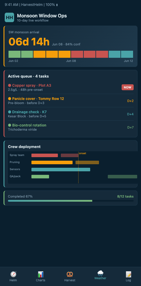 HarvestHelm treats the 10-day monsoon arrival window the way a yacht captain treats the final approach to a protected harbour during worsening weather. The helm-charted yield forecast consolidates all arrival-sensitive decisions into a single dashboard view with a countdown clock, a probability distribution of arrival dates, and specific action cards for each decision domain. The captain does not manage anchor, sails, engine, and crew calls as separate systems during the approach — the captain runs one coordinated sequence. Plantation monsoon workflows work the same way.