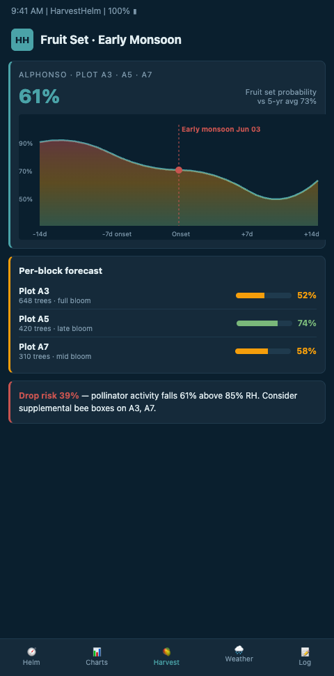 If your last one or two mango seasons lost tonnage to premature fruit drop after unseasonal or early monsoon rains, HarvestHelm can deploy canopy stress sensors and build the fruit set forecast for your Alphonso, Kesar, or Tommy Atkins blocks before next fruit set window opens. We pre-build intervention scenarios, map retention projections onto your export-shipping calendar, and only collect when retained tonnage actually ships to international packers. Zero upfront cost.