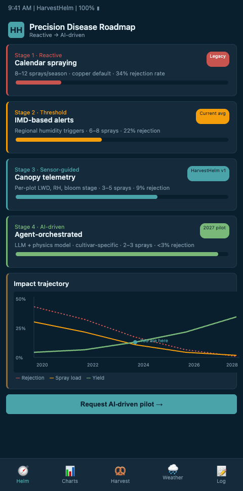 The plantations that will define the next decade of tropical mango are the ones that have already deployed canopy telemetry and are ready to plug in the AI diagnostic, UAV spraying, parametric insurance, and futures-curve layers as they mature. HarvestHelm's kilo-cut contract means you can stand up the data layer now without capex risk, and inherit each future-state capability as it arrives without re-engineering the infrastructure. If your Alphonso, Kesar, Banganpalli, Totapuri, Haden, or Tommy Atkins plantation intends to be in the export market in 2030, book a next-decade architecture review with our helm-integration team and start the infrastructure build before the next flower-induction window — the plantations that are already three seasons into their sensor fabric will be the ones whose 2030 Grade A tonnage compounds while their competitors' calendar programs quietly fail.