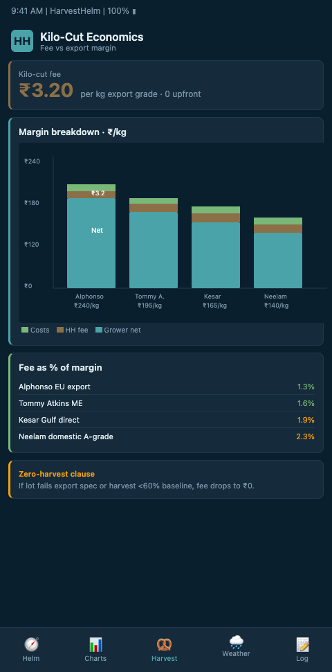 Mango exporters who have watched Konkan lose 80% of Alphonso in 2026 know the capex model is broken. A kilo-cut structure takes our side of the table off the plantation's books and puts HarvestHelm in the boat with the captain — we only get paid when the Grade A tonnage actually clears the packhouse. If your plantation spans 80 to 1,200 acres and you want a full helm-charted yield forecast running by next panicle-emergence window without adding a paisa to your capex budget, book a kilo-cut contract review with our export-economics team. We will walk through your last three seasons of APEDA-reported Grade A tonnage, model the cut brackets against your cultivar mix, and have a signed structure on your desk before flowering starts.