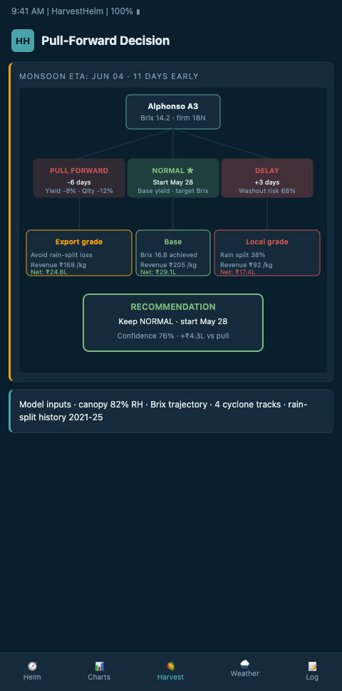 The pull-forward decision is the single highest-leverage call a mango plantation manager makes each year. Four days of precision in either direction determines whether 50 lakh rupees of export revenue clears or rots. HarvestHelm's kilo-cut revenue model means the platform only gets paid when export-grade fruit actually clears customs — aligning the dashboard's recommendations directly with the grower's outcome. A plantation running on calendar pull-forward rules is a ship navigating by dead reckoning; a plantation running on helm-charted yield forecast logic is reading the glass, the wind, and the swell from onboard instruments. Ratnagiri and Valsad managers who have adopted this approach report 8 to 14 percent lifts in export-grade conversion over three consecutive monsoon seasons. The monsoon will do what the monsoon does. Your dashboard decides whether you outrun it or get caught by it.