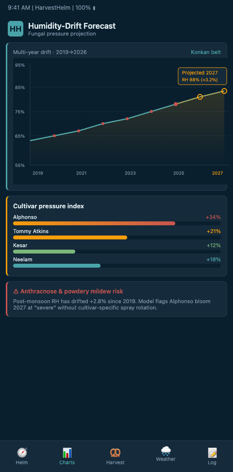 A Konkan Alphonso estate that ran the multi-year drift analysis across its 2018-2024 records found conidia-germination-hour counts trending upward at roughly 6.8% per season, leaf-wetness integrals drifting +38 hours per season during the pre-flush window, and minimum-temperature envelopes narrowing by 0.4°C per season. Each signal on its own looked like noise; stitched together into a single drift dial, they pointed at a compound fungal-pressure trajectory that would cross the plantation's historical tolerance envelope by 2027 if nothing changed. That forward-looking number changed the plantation's capex planning — they shifted from copper-heavy rotations to a bio-control-dominant program three seasons earlier than they otherwise would have, which preserved Grade A margin across the transition rather than conceding it.