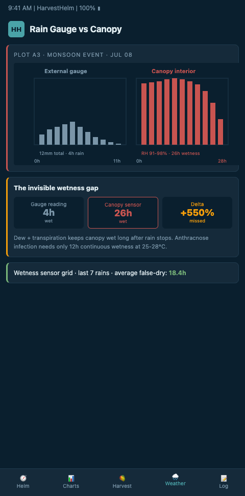 The failure mode plays out every monsoon season. A rain gauge reports 3 mm overnight rainfall; manager concludes "no fungal spray needed today." Canopy-internal humidity sustained 96% for seven hours, leaf wetness integral crossed the anthracnose threshold, and an infection window opened and closed unnoticed. Two weeks later, lesions appear and the manager wonders what went wrong.