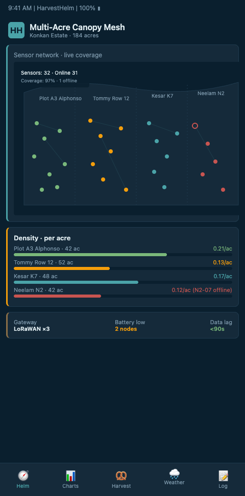 Scaling canopy telemetry on a tropical mango estate is less about adding sensors and more about redesigning the helm-charted yield forecast so the captain can still read the chart when the fleet triples. A yacht's navigation dashboard does not get harder to read when the crew expands — it gets more decisive because every instrument feeds one integrated helm. The same principle drives HarvestHelm's plantation-scale architecture. Instead of 14 panicle sensors reporting to one gateway, a 400-acre estate runs a three-tier mesh: edge nodes at the canopy, aggregators at the block, and a helm-synthesis layer that compresses thousands of readings into leaf-wetness integrals, anthracnose-pressure indices, and monsoon-onset variance tracks.