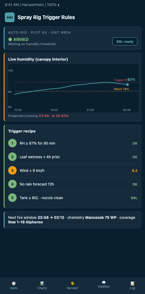 HarvestHelm approaches fungicide triggering the way a yacht captain reads the chart plotter before adjusting course. The helm-charted yield forecast pulls canopy-level RH, leaf wetness duration, and temperature from sensor clusters spaced roughly every 200 metres inside the canopy — not from the 50-km regional grid that satellite products rely on. When the dashboard registers sustained RH above 92 percent for two consecutive hours during flowering, the system fires a trigger flag to the spray rig queue. The grower still sees the recommendation on the yacht-style dashboard and confirms the pass, but the rig no longer rolls out on calendar autopilot.