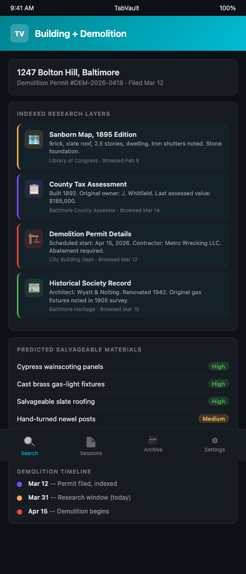 Every demolished building is a closed book. Once the wrecking crew finishes, the opportunity to evaluate and salvage materials is gone permanently. The research window between a demolition permit filing and the start of demolition work is your opportunity to determine whether a site visit is worth the trip — and what tools and transport to bring. A demolition schedule tells you when. Historical building records tell you what. Combining both tells you whether a site visit is worth your time and what to bring when you go. TabVault indexes both data streams into one searchable archive, giving you the historical preservation salvage research edge that separates prepared dealers from those who rely on luck. Join the waitlist and start researching buildings before the wrecking crew arrives.