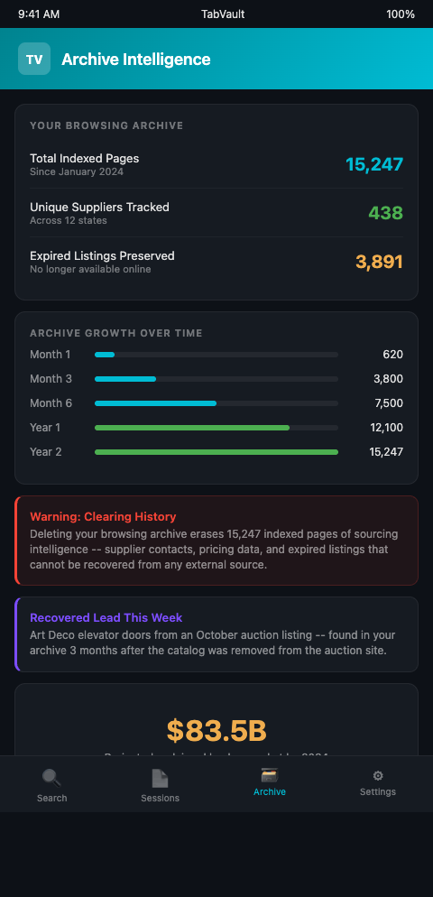 The difference between a dealer with a mature indexed archive and one without is the difference between a researcher with a library and one with only their memory. The archive does not replace expertise — it amplifies it. It makes every observation, every price point, and every supplier interaction retrievable instead of relying on recall alone. Every page you have browsed during your salvage sourcing career is a data point that a competitor does not have. Clearing that history is clearing competitive advantage. TabVault preserves your indexed browser archive automatically, turning your accumulated browsing into a permanent, searchable business asset. Join the waitlist and stop throwing away the research that took you years to build.