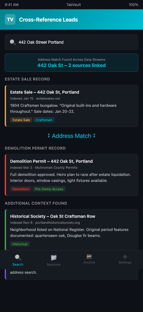 TabVault's full-text indexing makes this cross-reference possible because it captures more than just URLs. It captures the text content of each page — sale descriptions mentioning "original Victorian hardware," permit notes specifying "full demolition," property addresses, dates, and contact information. A search for "Queen Anne" might surface an estate sale listing describing the home's style alongside a renovation permit for a Queen Anne property three blocks away. These are the kinds of connections that emerge when disparate records are unified under one search layer — the same principle that investigative producers apply when searching court records across multiple state jurisdictions to build cases from fragmented public data.